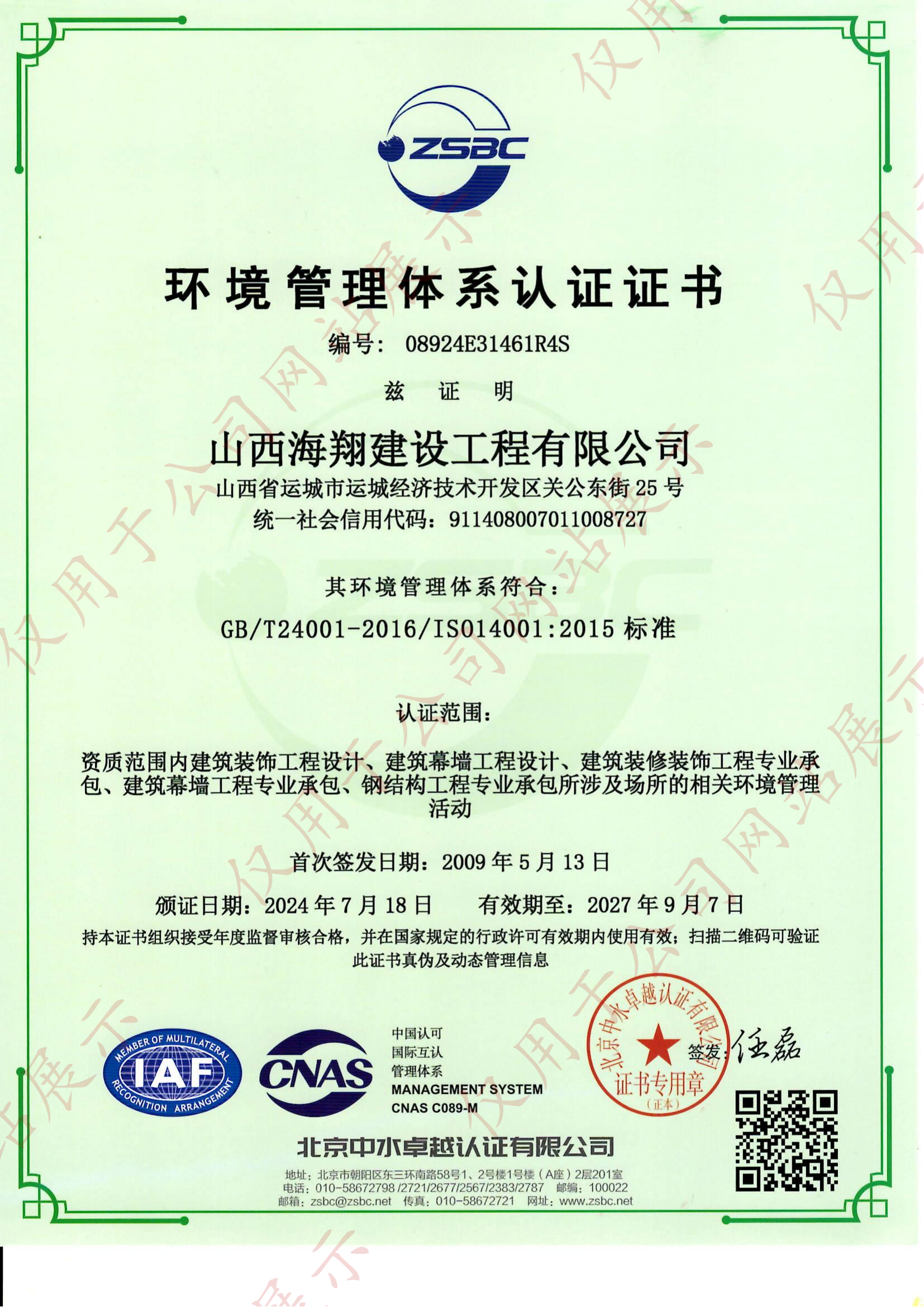 環(huán)境管理體系認(rèn)證證書